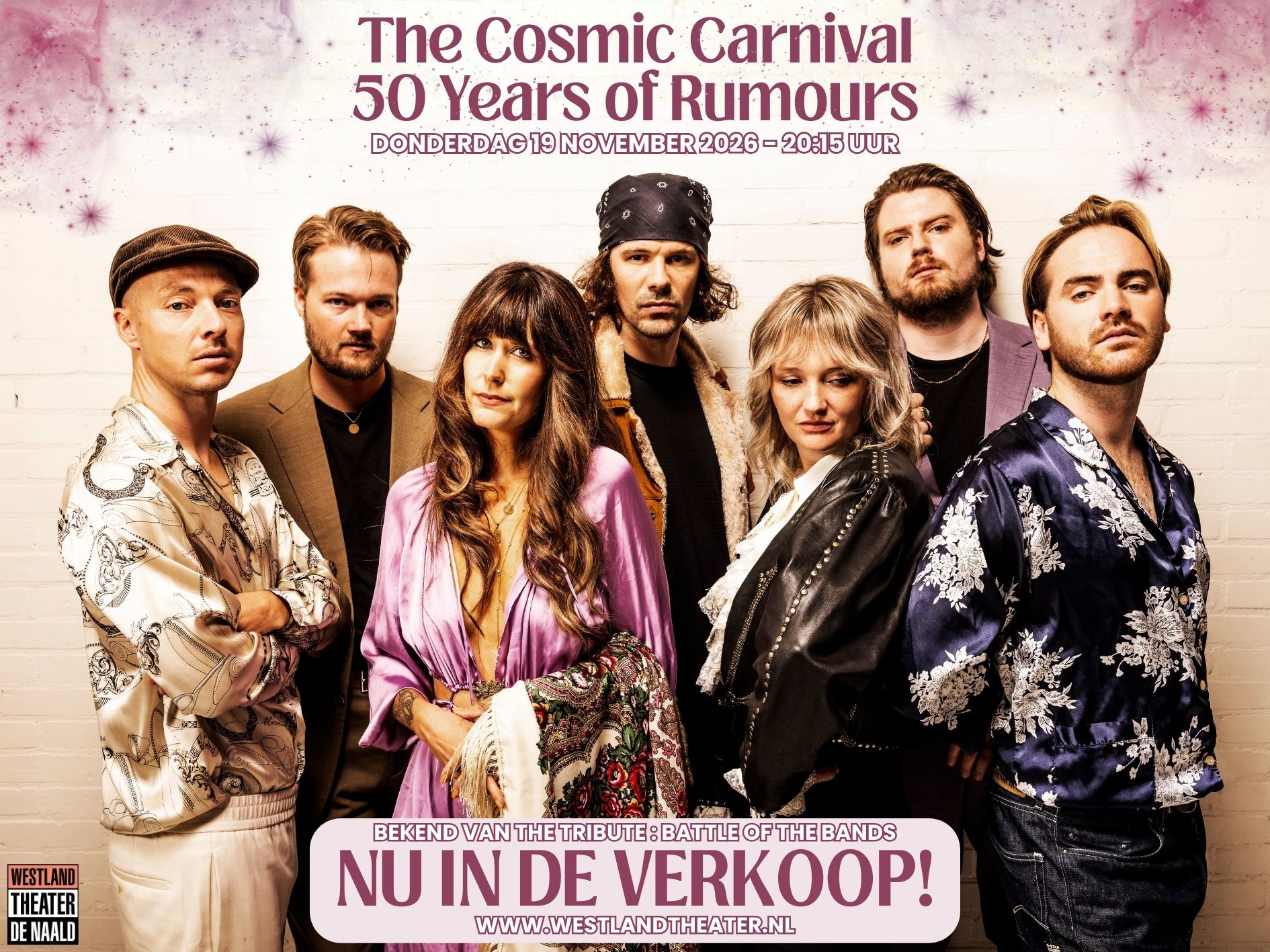 The Cosmic Carnival is al jarenlang een geliefde en veelgevraagde naam in theaters en clubs als dé Fleetwood Mac tribute. Als finalist van seizoen 5 in het SBS6 programma the Tribute Battle of the Bands overtuigde de band zowel vakjury als publiek met hun authentieke en gepassioneerde vertolking van het Fleetwood Mac repertoire. Op donderdag 19 november komen zij naar De Naald!